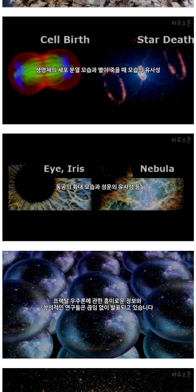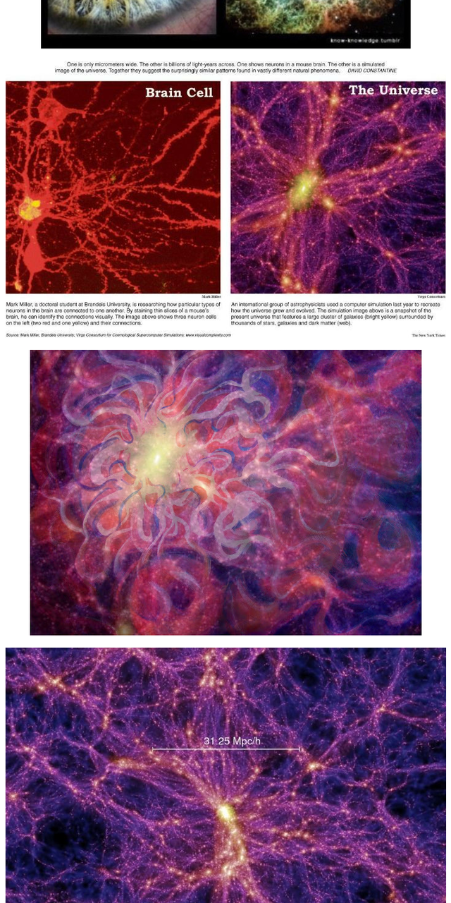 홍채가 성운과 비슷하게 생겼고, 인간의 신경 세포가 우주 거대 구조와 흡사하며, 세포의 분열 과정이 별의 죽음과 비슷한 모양이라는 등의 예를 그 증거로서 제시한다.