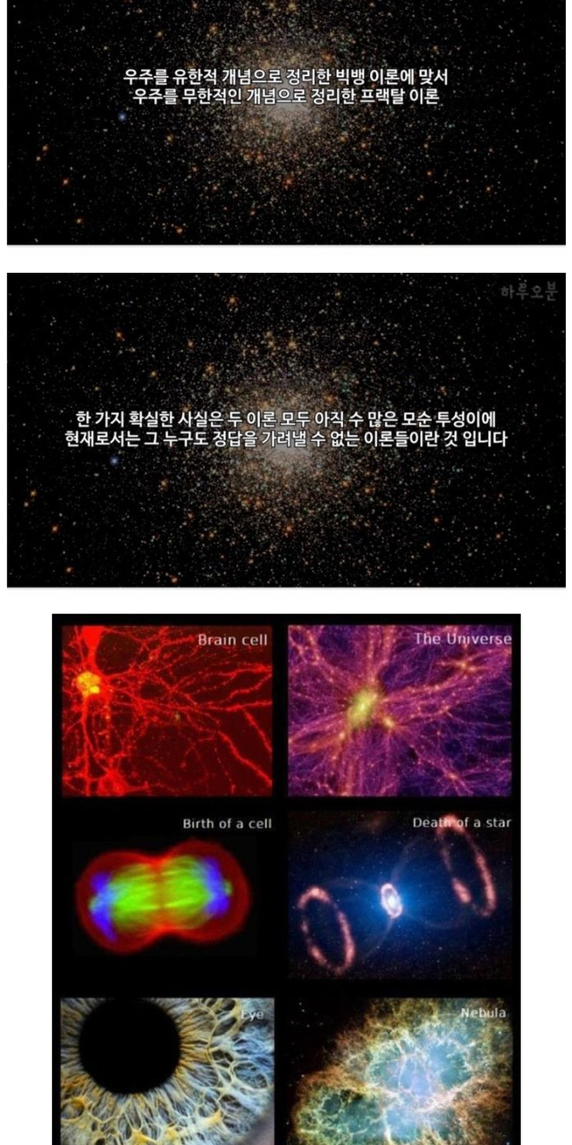 프랙탈 우주론이란 쉽게 설명해 우리가 살아가는 이 우주를 하나의 입자라고 보고, 그 우주를 이루고 있는 무수한 입자들 속에 또 다른 무한한 우주가 재현되고 있다는 이론이다.