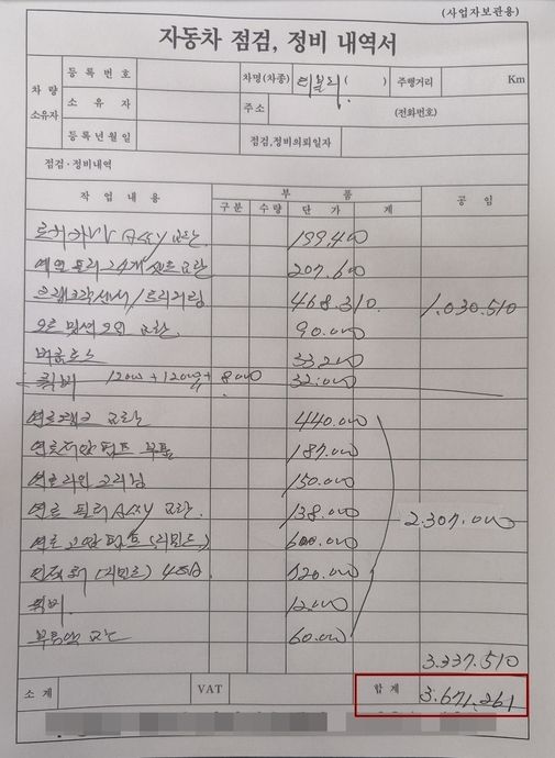 이 대표는 “실제 교체한 부품은 엔진오일 누수 관련 커버와 크랭크 센서 뿐”이라며 “현재 차량은 정비가 완료되지 않은 중간 단계로, 고객이 말하는 것처럼 모든 수리를 마음대로 하고 덤터기를 씌우진 않았다”고 주장했다.