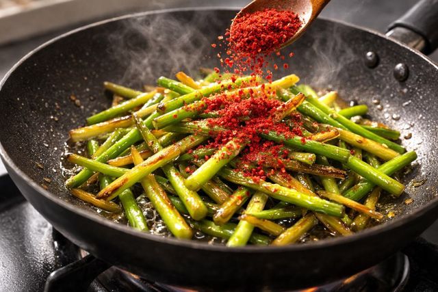 마늘쫑 볶음 마지막 단계, 고춧가루 팍 뿌리기. 기사 내용 토대로 AI툴 활용해 제작한 자료사진.