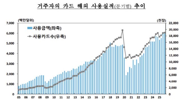 지난 2023년에 이어 3년 연속 최대치를 경신한 셈이다. 증가폭은 지난 2023년 32.2%에서 2024년 13.0%, 2025년 5.5%로 감소 중이지만 거주자의 해외여행 수요가 늘어나면서 카드 사용액 증가세가 이어진 것으로 풀이된다. 한은 관계자는 “해외여행 수요가 늘어난데다 해외 직접구매액이 늘어난 영향”이라고 설명했다.