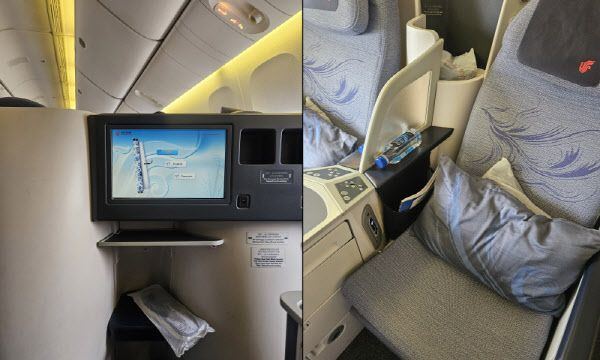 먼저 에어차이나 전용 비즈니스 라운지를 방문했다. 바뀐 항공권을 보여주니 입장이 가능했다. 라운지에서는 간단히 끼니를 해결할 면 요리와 빵, 과일, 컵라면, 음료 등이 비치됐다. 편히 앉아서 전자기기를 충전할 수 있는 좌석도 마련됐다. 라운지에서 충분히 휴식한 후 탑승 게이트로 이동했다. 별도로 줄을 서지 않고도 비즈니스석 전용 입구로 들어가서 자리에 앉았다. 이번에 이용한 항공기는 중장거리 모델인 보잉 777로 일등석(토우덩창)은 8석, 비즈니스석(공우창) 42석이 있었다.