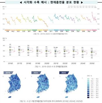 이번 조사에서 담배제품 현재사용률의 시·군·구 중앙값은 22.1%로 전년(22.6%) 대비 0.5%p 감소했다.