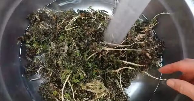 5분이 지나면 냉이를 건져 흐르는 물에 한 번 헹군다. 이때 뿌리 부분을 중심으로 가볍게 문질러 준다. 이미 콩가루가 흙을 분리해 놓았기 때문에 세게 문지르지 않아도 깨끗해진다. 마지막으로 맑은 물에 한 번 더 헹구면 총 10분 이내에 세척이 끝난다.