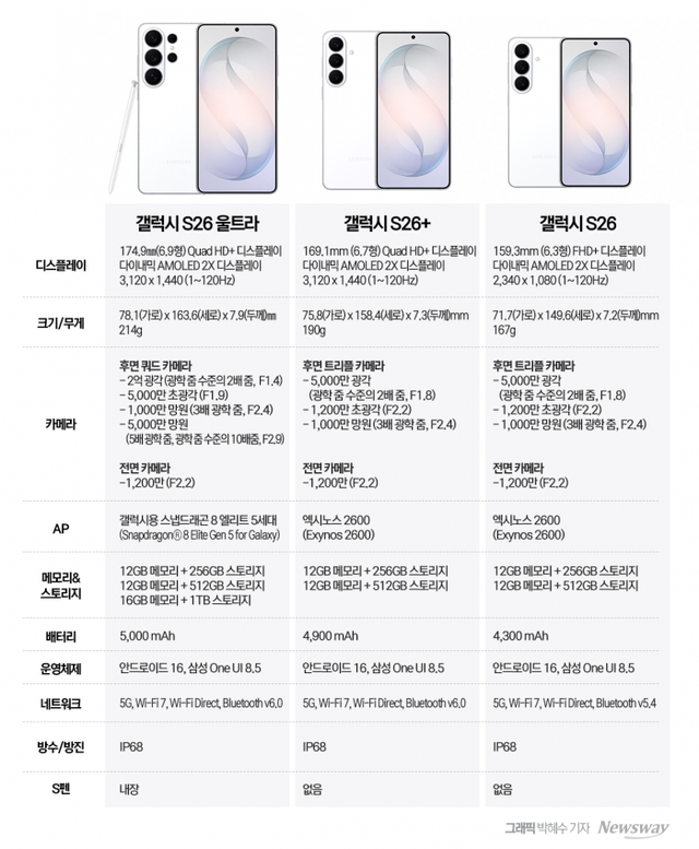 '갤럭시 S26 시리즈'는 '갤럭시 S26 울트라', '갤럭시 S26+', '갤럭시 S26' 총 3개의 모델로 구성된다. 전작 대비 대폭 강화된 하드웨어 성능과 카메라, 한층 진화한 갤럭시 AI 기능을 집약한 플래그십 라인업이다.