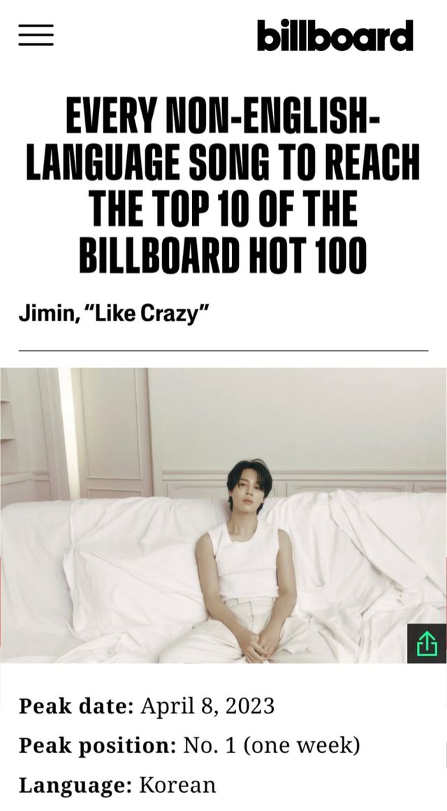 더불어 지민은 ‘Like Crazy’가 ‘핫100’ 1위를 기록한 같은 주, 빌보드 ‘아티스트 100’ 차트에서도 1위를 차지했다. 해당 차트에서 1위에 오른 최초이자 유일한 솔로 가수로 이름을 올렸으며, 이 기록은 지금까지 유지되고 있다.