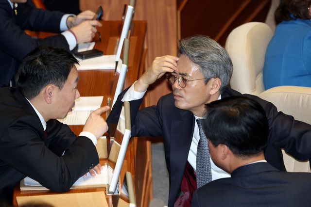 지난 25일 서울 여의도 국회에서 열린 제432회국회(임시회) 8차 본회의에서 김용민, 김기표, 박균택 더불어민주당 법제사법위원들이 대화하고 있다. / 뉴스1