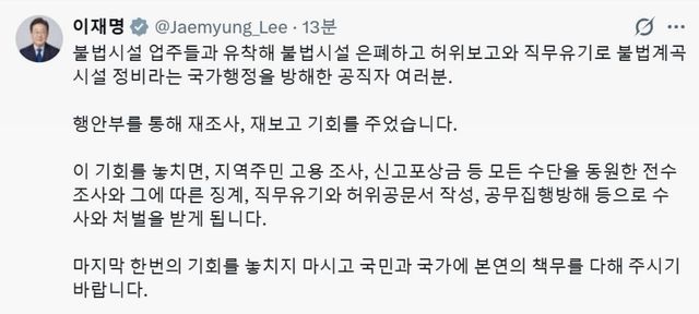 이 대통령은 26일 자신의 X(옛 트위터)에 “불법 시설 업주들과 유착해 시설을 은폐하고 직무유기로 국가 행정을 방해한 공직자들에게 행정안전부를 통해 재조사와 재보고의 기회를 주었다”는 내용의 게시글을 올리며 서 “마지막 한 번의 기회를 놓치지 말라”고 경고했다.