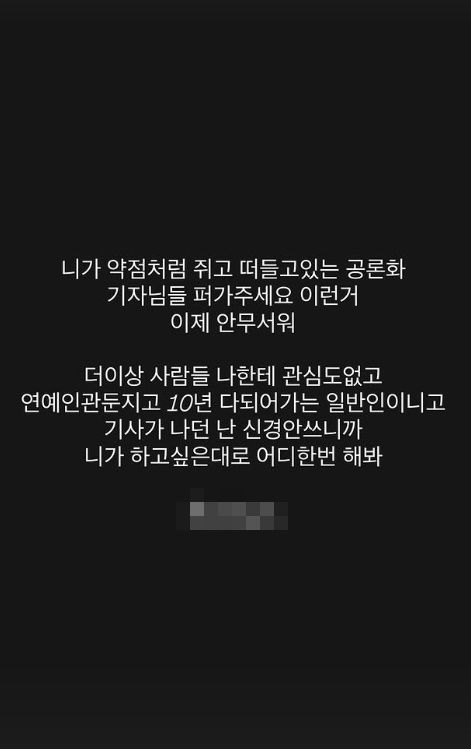 이어 “공론화가 더 이상 두렵지 않다. 연예 활동을 중단한 지 10년 다 되어가는 일반인”이라며 “하고 싶은 대로 해보라”는 취지의 글을 남겼다. 다만 A씨가 제기한 구체적인 의혹에 대해서는 직접적인 해명은 하지 않았다.