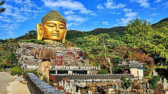 나뭇잎 사이로 바람 소리만 스치는 산길을 걷다가 문득 고개를 들었을 때, 시야를 가득 채우는 거대한 황금빛 불두와 마주한다면 어떤 느낌일까. 순간 시선이 멈추고 잠시 호흡을 고르게 되지만, 이내 부드러운 표정이 주는 분위기 덕분에 마음이 차분해진다.