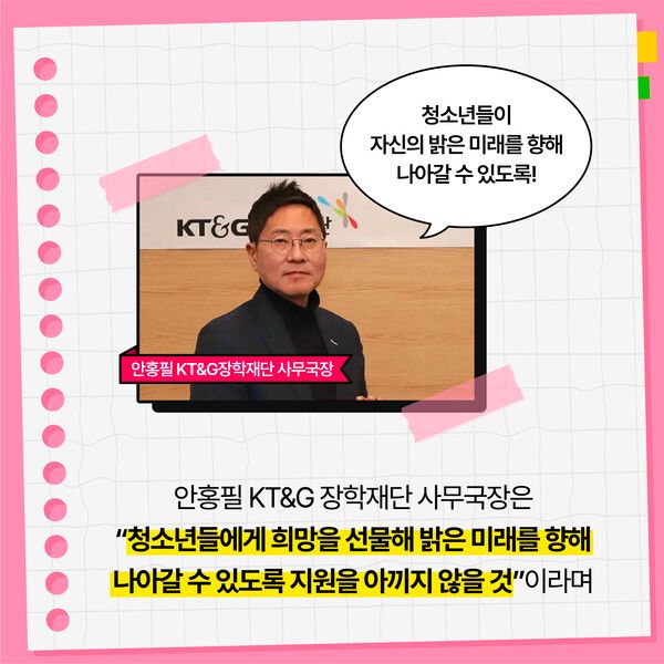 안홍필 KT&G장학재단 사무국장은 “청소년들에게 희망을 선물해 밝은 미래를 향해 나아갈 수 있도록 지원을 아끼지 않겠다”며 “앞으로도 사회적 도움이 필요한 청소년들이 안정적인 환경에서 건강하게 성장할 수 있도록 지속적으로 지원하겠다”고 밝혔다.