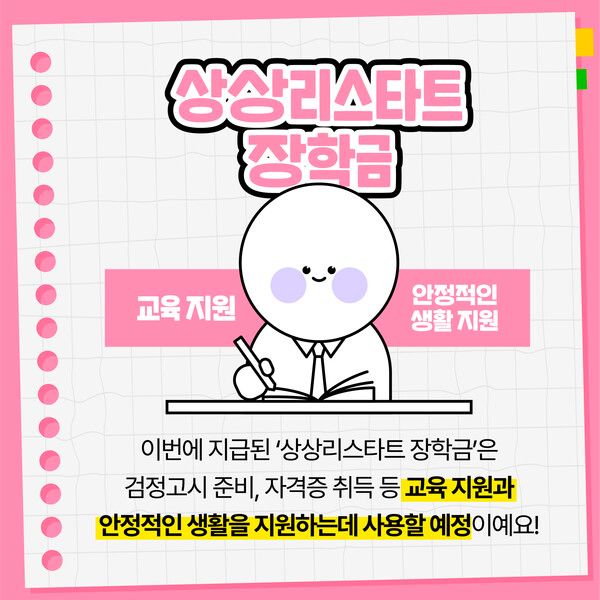선발된 청소년들은 검정고시 준비, 자격증 취득 등 학업과 진로 역량 강화를 위한 교육비와 함께 안정적인 생활을 위한 지원을 받게 된다.