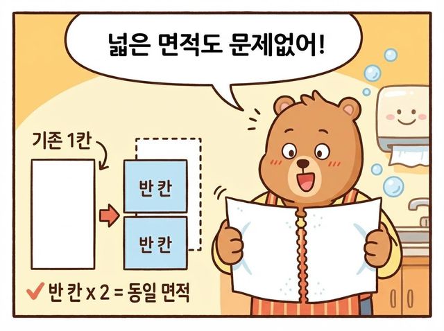 만약 기존처럼 넓은 면적의 키친타월이 필요한 상황이라면 어떻게 할까? 해결책은 간단하다. 절반 크기의 타월을 두 칸 뜯어서 사용하면 기존 규격과 동일한 면적을 확보할 수 있어 사용상의 불편함도 전혀 없다.