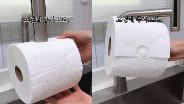 자른 키친타월의 단면을 고정하기 위해 싱크대 수전을 활용하는 방법이다. 먼저 수전의 물을 아주 잠깐 틀었다가 잠근 뒤, 키친타월의 끝부분(펄럭이는 부분)을 수전 입구의 남은 습기에 대고 꾹 눌러준다. 마치 도장을 찍듯 고정해 주면 젖은 부분이 접착제 역할을 해 단단히 밀착된다. 이후 평소처럼 홀더에 끼워 사용하면 깔끔하게 보관하며 한 장씩 뜯어 쓸 수 있다.