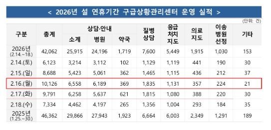 [와이뉴스] 소방청은 2026년 설 연휴 기간(2.14.~2.18., 5일간)전국 총 45,082건의 구급 출동으로 24,166명을 이송하였으며, 구급상황관리센터에서 총 42,062건의 상담을 실시했다고 밝혔다.