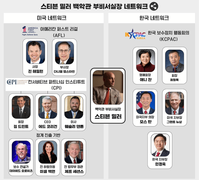 밀러 부비서실장의 인적 네트워크에는 한국인들도 다수 포함돼 있다. 미국 내 한인 보수 연합체인 KCPAC(한국보수정치행동회의)가 대표적이다. 밀러 부비서실장은 미국 보수 단체 '보수정치행동회의(CPAC)'가 주최하는 행사에 꾸준히 참석하고 있는데 KCPAC 역시 지난 2019년부터 지난해까지 매년 CPAC 국제 파트너 자격으로 행사 주최에 힘을 보태고 있다. 또 밀러 부비서실장은 진보 진영의 정체성 정치와 DEI(다양성·형평성·포용성) 정책이 미국 사회를 망치고 있다고 주장하고 있는데 KCPAC는 그의 목소리를 한국계 커뮤니티에 전파하는 스피커 역할을 맡고 있고 있다. KCPAC을 포함한 한인 보수 단체들은 "법을 지키는 합법 이민자가 존중받아야 한다"며 강경 이민 정책에도 힘을 보태고 있다.