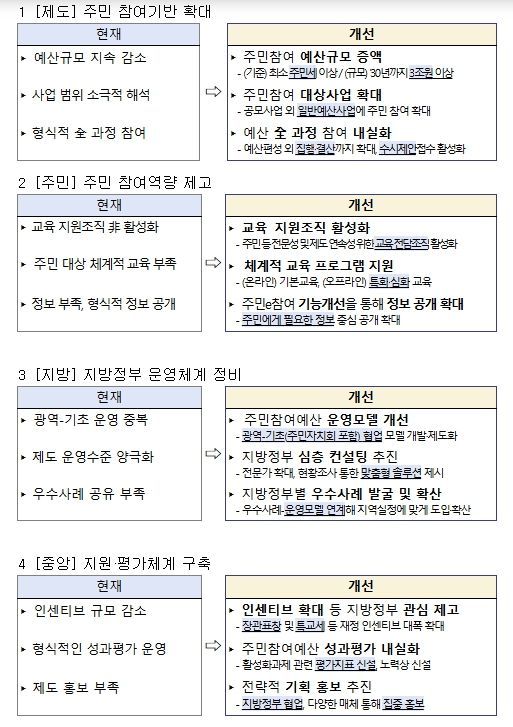 행정안전부는 주민참여예산제도가 현장에서 더욱 활성화되도록 주민, 전문가 등의 의견을 수렴해 다음과 같은 중점 추진 과제를 마련했다.