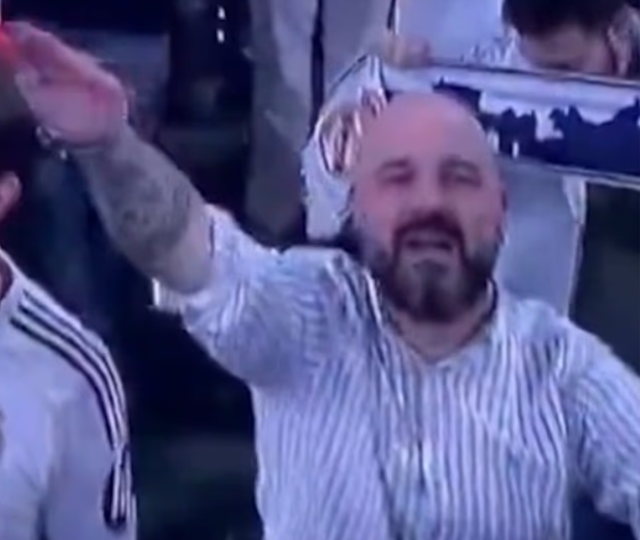 '디 애슬레틱'에 따르면 26일 레알의 홈구장 산티아고 베르나베우에서 열린 레알과 벤피카의 2025-2026시즌 UEFA 챔피언스리그 16강 플레이오프 2차전에 앞서 경기장 한켠에서 나치식 경례를 하는 듯한 행동을 보인 팬이 중계 카메라에 포착됐다.