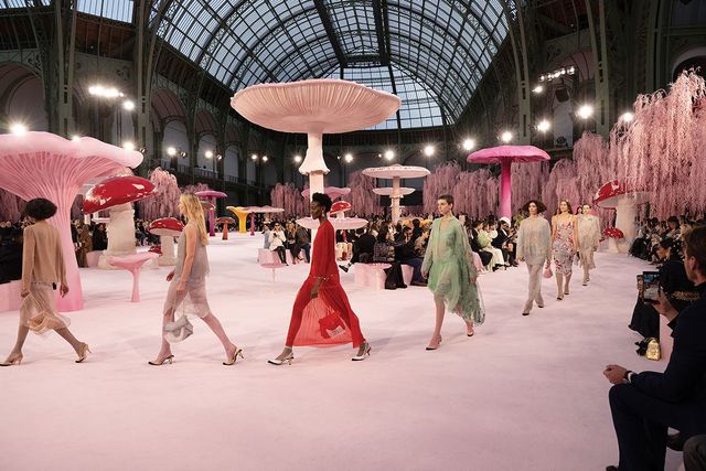 마티유 블라지가 선보인 샤넬 2026 봄/여름 오트 쿠튀르 컬렉션은 바로 이 ‘참을 수 없는 가벼움’의 중요성을 환기하는 쇼였다. 그랑 팔레를 가득 채운 것은 파스텔 톤의 거대한 버섯들과 분홍빛 버드나무였다. 동화 속 한 장면 같은 이 무대에서, 샤넬이 나눠준 쇼 노트는 한 편의 하이쿠(haiku・俳句)로 시작됐다. “버섯 위의 새/ 찰나의 아름다움/ 날아가 버렸네”(작자 미상). 이 짧은 시는 컬렉션 전체를 압축했다. 덧없이 아름다운 것, 금방 날아가 버릴 것 같은 것, 그러나 바로 그 가벼움 때문에 더욱 소중한 것.