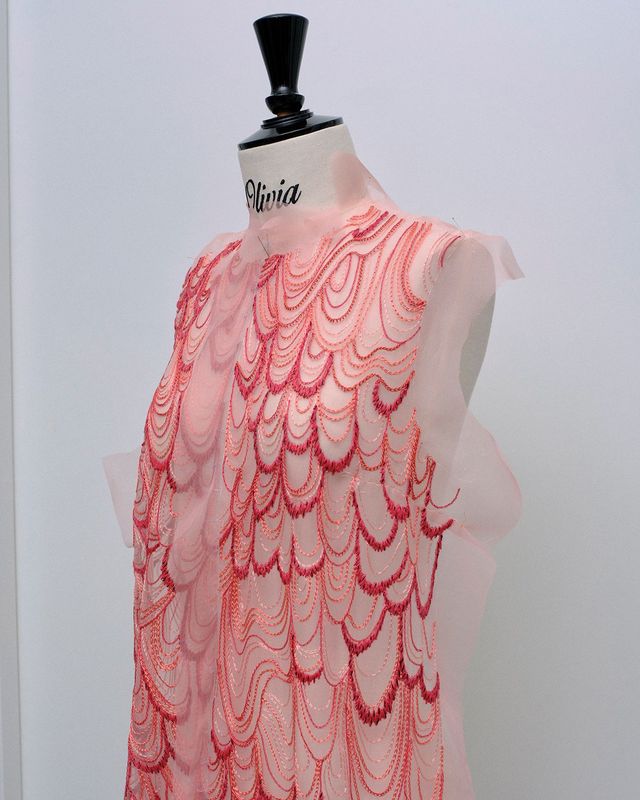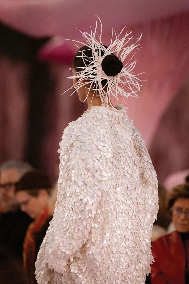 트위드부터 데님까지 가벼움의 극치를 보여주는 룩에 이어, 샤넬의 직조 기술을 살린 룩들이 등장하며 변신이 시작됐다. 컬렉션의 중심에 선 여성들이 서서히 새의 형태를 띠기 시작한 것이다. 회색빛 비둘기의 소박함, 핑크빛 저어새의 화려함, 왜가리의 날렵함, 코카투의 장엄함, 흔한 것부터 이국적인 것까지, 새들은 le19M 공방 장인들의 손끝에서 옷으로 태어났다. 하지만 깃털은 거의 사용되지 않았다. 대신 자수로, 플리츠로, 직조로 깃털의 본질만 남겼다. 마티유 블라지가 말한 ‘모킹 버드(Mocking Birds)’는 가짜 깃털이 아니라 깃털의 정수를 재해석한 것이었다. 또한 착용자의 몸의 형태에 따라 자연스럽게 만들어지는 실루엣은 옷이 주어진 형태가 아니라 입는 사람이 만들어낸 형태임을 보여줬다. 마티유 블라지는 스케치도, 레퍼런스 이미지도 없이 모델의 몸 위에서 직접 이 컬렉션을 제작했다고 밝혔다. “그것이 바로 쿠튀르의 정의입니다.” 그의 말처럼, 이 옷들은 착용자 없이는 완성되지 않는다. 아틀리에 ‘플루’와 테일러의 최고급 재단 기술이 집약된 레이븐 블랙 룩부터 자수, 레이어링, 플리팅, 직조를 통해 표현된 복잡한 컬러의 깃털까지, 모든 것은 소재와 컬러의 중첩이 있지만 어느 것 하나 무거운 느낌이 없었다. 옷들은 하나같이 쇼장의 가벼운 바람에도 자연스럽게 리듬감을 만들어냈다. 마티유 블라지는 컬렉션을 설명하며 ‘감각’이라는 단어를 사용했다. 이 옷들은 보는 것을 넘어 만지고, 느끼기 위한 것이었다.