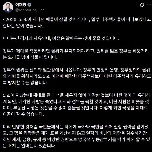 이 대통령은 오는 5월 9일을 끝으로 종료하는 다주택 양도세 중과 유예와 관련해서는 "정부의 권위는 신뢰와 일관성에서 나온다. 권위를 잃은 정부는 뒤뚱거리는 오리를 넘어 식물이 된다"며 "정부 정책의 권위와 신뢰를 위해 5월 9일 이전에 매각한 다주택자보다 버틴 다주택자가 유리하도록 방치할 수 없다"고 강조했다.
