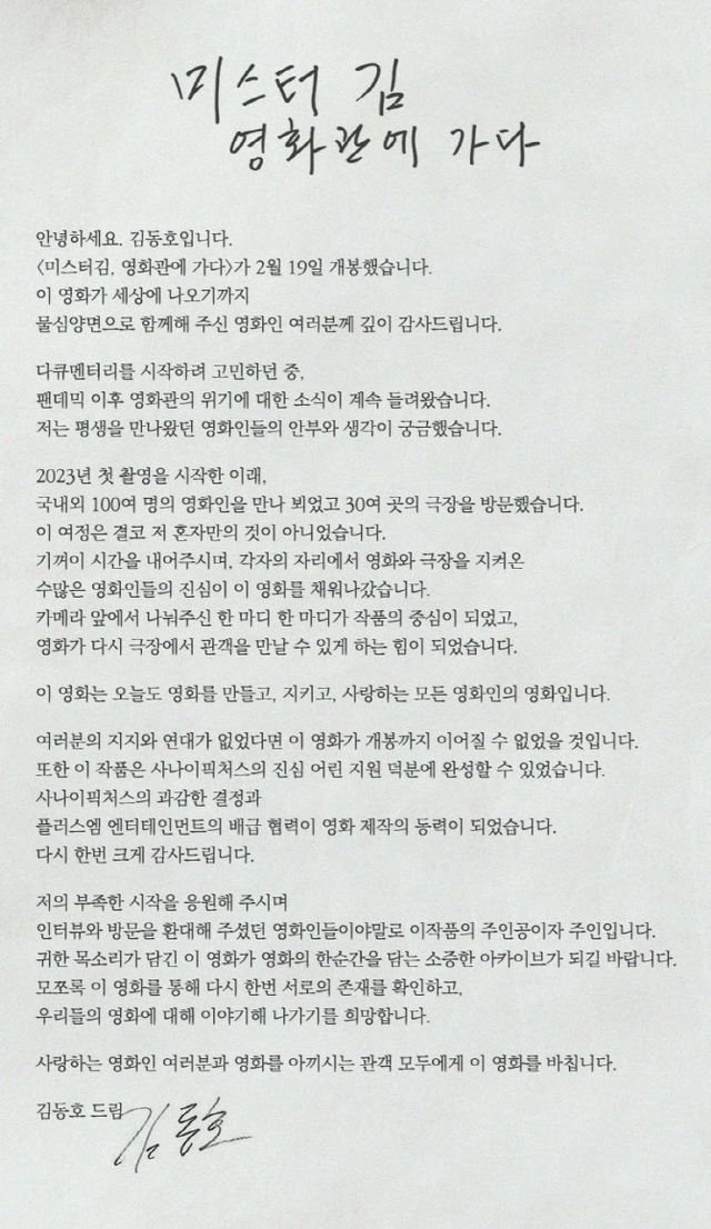 ‘미스터김, 영화관에 가다’가 작품을 연출한 김동호 전 부산국제영화제 위원장이 영화인들에게 보내는 감사 편지를 공개했다.