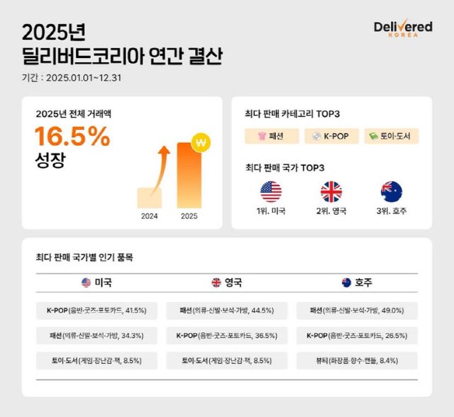 지난해 딜리버드코리아 역직구 데이터에 따르면 역직구 카테고리별 매출 1위는 패션(의류·신발·보석·가방)으로, 전체의 36.7%를 차지했다. K팝(음반·굿즈·포토카드)은 34.5%로 2위에 올랐고, 다음으로는 토이·도서(10.0%), 뷰티(7.3%), 홈·주방·리빙 제품(6.3%) 등이 뒤를 이었다.