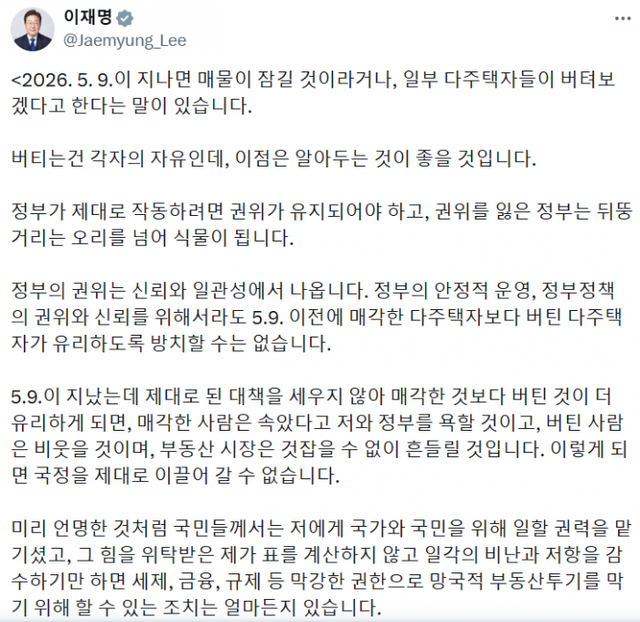 이재명 대통령이 27일 자신의 소셜미디어(X·옛 트위터)에서 다주택자들을 향해 강도 높은 규제를 예고했다. 사진=X 갈무리