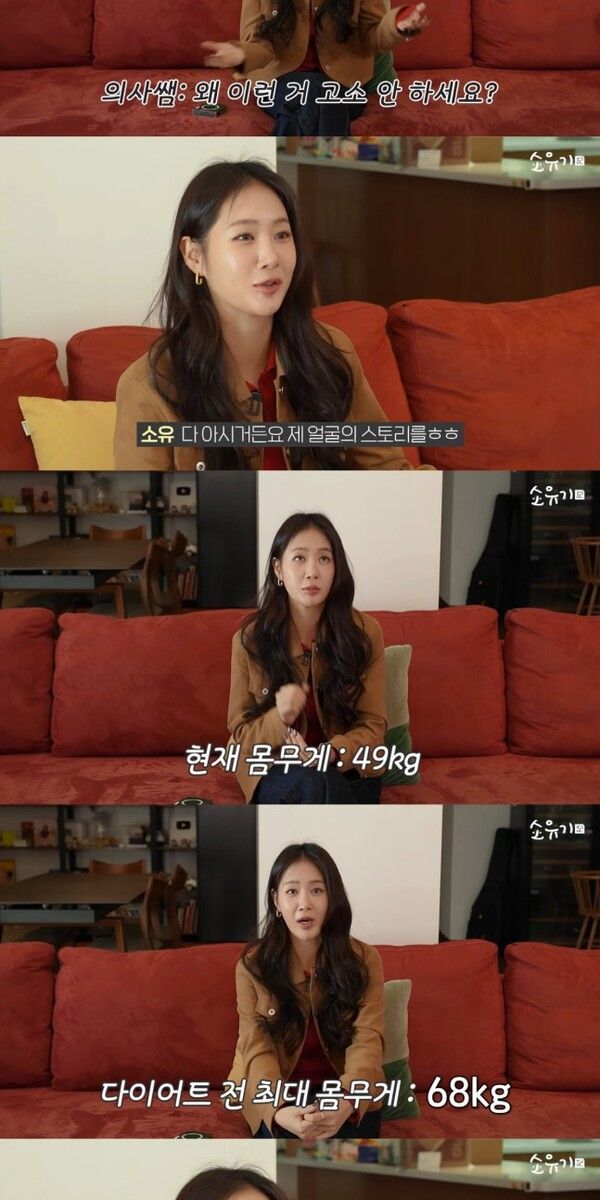 얼굴형이 바뀐 결정적인 이유로 소유는 드라마틱한 체중 감량을 꼽았다. 그는 현재 몸무게가 49kg인데, 다이어트 전 최대 몸무게는 68kg이었다고 솔직하게 고백했다. 이어 사람들이 보통 10kg 정도 뺀 줄 아시는데 정확히 따지면 20kg을 감량한 것이라며, 이 정도 무게가 빠지면 얼굴형이 변할 수밖에 없지 않겠냐고 반문했다.