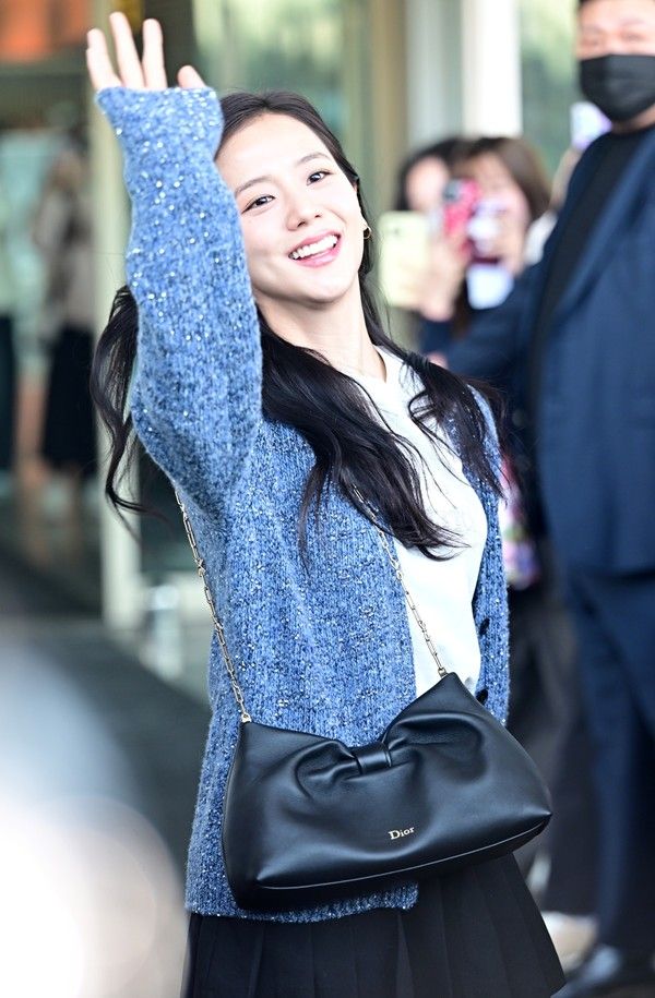 지수의 공항 패션은 디올 제품으로 완성됐다. 블루 컬러 가디건에 화이트 레터링 티셔츠를 매치해 산뜻한 스타일링을 선보였으며, 블랙 컬러 ‘J'Adior’ 펌프스와 ‘디올 보우 백’을 더해 세련된 무드를 강조했다.