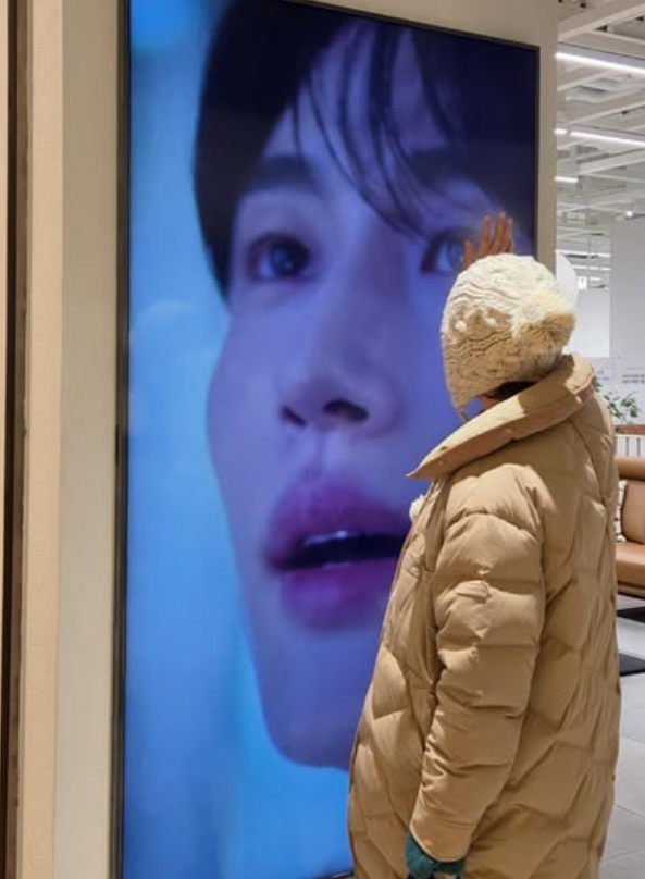 공개된 사진 속 박미선은 쇼핑몰 벽면에 붙은 광고 전광판 속 배우 변우석의 얼굴을 어루만지는 포즈를 취하고 있다.