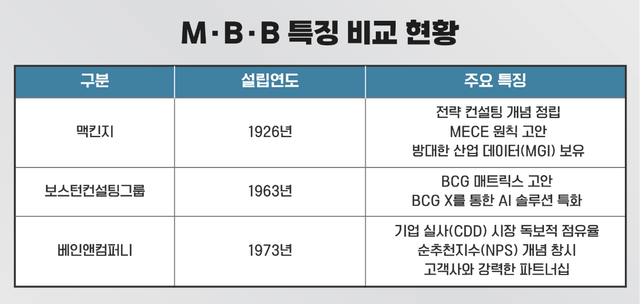 1926년 설립된 맥킨지는 'MBB' 중 가장 오랜 역사와 권위를 자랑한다. 오랜 기간 '전략 컨설팅'이라는 개념을 정립한 주역으로 평가받으며 지금까지도 굳건한 위상을 자랑하고 있다. 맥킨지가 현재까지도 글로벌 비즈니스 현장에서 압도적인 위상을 자랑하는 배경에는 독보적인 데이터 분석력과 논리 프레임워크(목적 달성을 위한 해결 방법 혹은 구조) 구축 능력 등이 자리하고 있다. 맥킨지 글로벌 연구소(MGI)를 통해 축적한 전 세계 산업 데이터는 글로벌 경제 분야의 가장 강력한 빅데이터 자산으로 복잡한 사안을 명쾌하게 구조화하는 부분에서 탁월한 성과를 내고 있다.