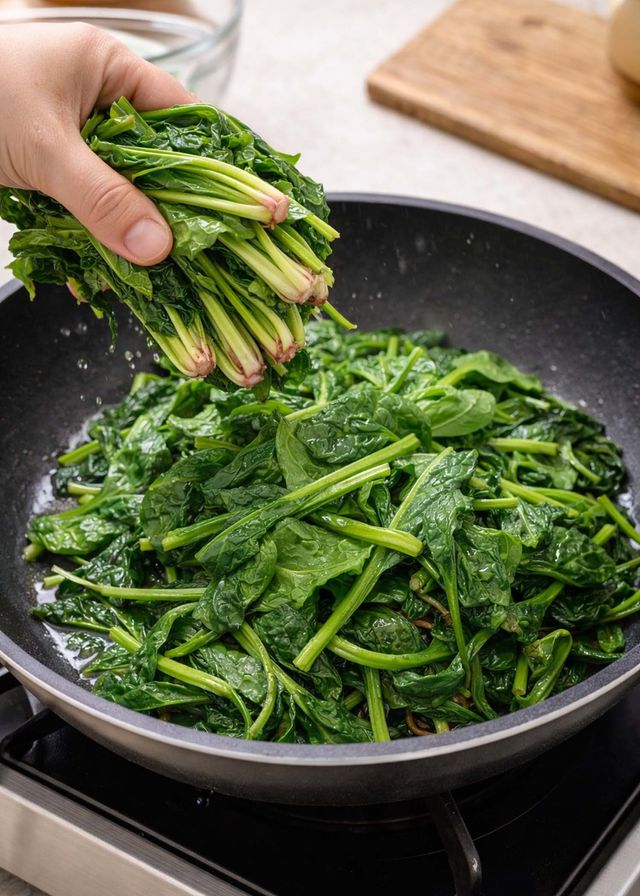 시금치를 공심채처럼 볶는 모습. AI 툴로 만든 사진.