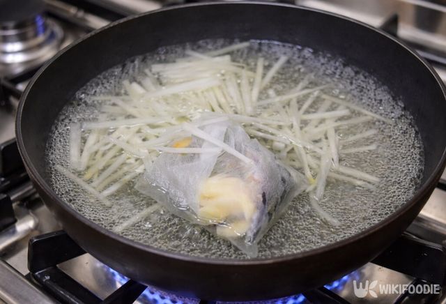 다시 팩을 건진 뒤 채 썬 무 150g을 넣고 한 번 더 끓인다. 무가 투명해지면 참치액 3큰술을 넣어 간을 맞춘다. 참치액은 향이 부드러워 국물 맛을 깔끔하게 정리해 준다. 부족한 간은 소금으로 조절한다.