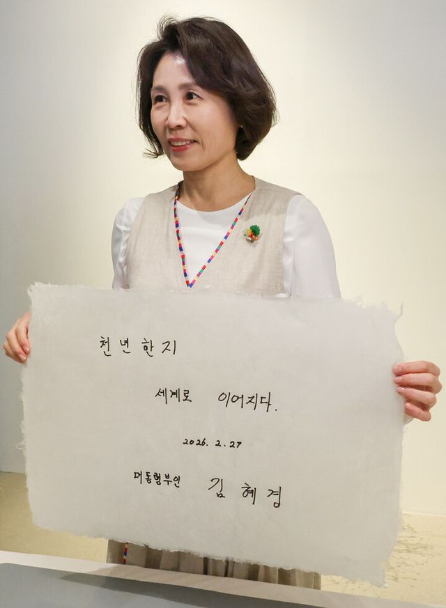 그러면서 김 여사는 이날 직접 만든 한지에 ‘천년한지 세계로 이어지다’라는 문구로 방명록을 남겼다.
