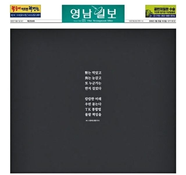 대구·경북(TK) 행정통합 특별법 처리가 무산되자 지역 신문인 영남일보가 1면을 기사 없이 검은색으로 채우며 항의의 뜻을 전했다.