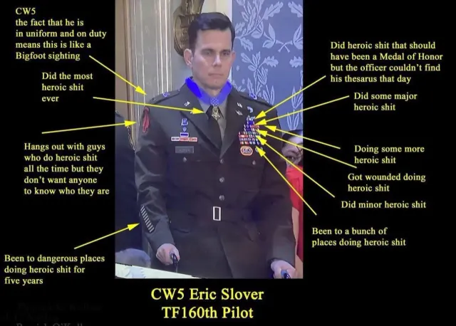 걍...생긴것만봐도 참군인을 넘어서 절대 적으로 만나고싶지않게 생긴 슬로버는 '살아서는 받기 힘들다는' 명예훈장 군 경력 20년차에 수여받았는데, 그 가슴에 달린 약장만봐도 그가 얼마나 엘리트인지 알 수 있음.