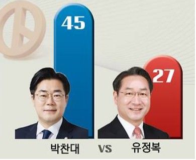 경인일보가 2월23일자로 보도한 여론조사 결과에 따르면, 인천시장 후보 양자가상대셜에서 박찬대 의원 45%, 유정복 현 시장 27%로 거의 더블스코어로 박 의원이 앞서는 결과가 나왔다.
