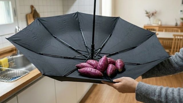 우산 위에 고구마를 올려놓은 모습의 자료사진. AI가 생성한 자료사진.