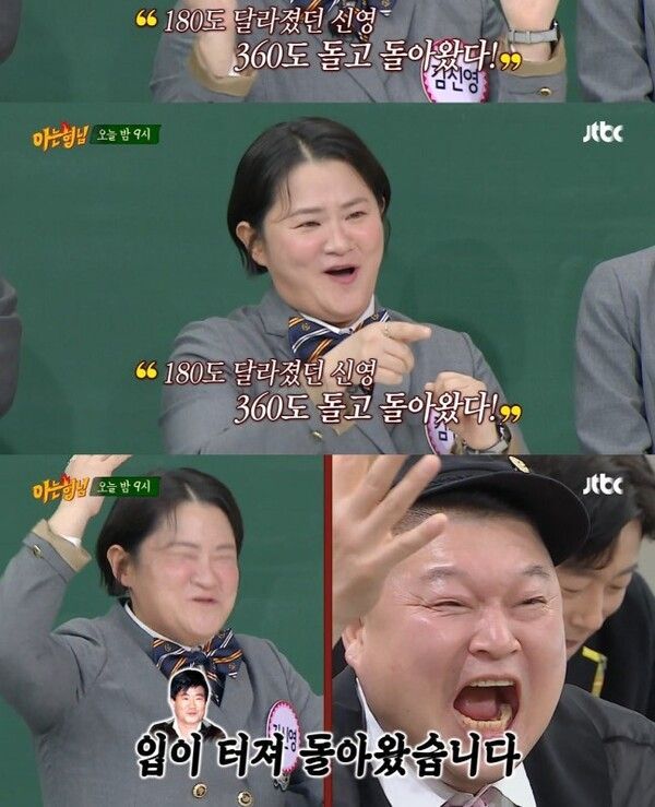 이에 김신영은 자신의 전매특허인 배우 이계인 성대모사를 활용해 재치 있게 화답했다. 그는 입으로 먹고사는 신영이가 입이 터져서 다시 돌아왔다며 자신의 체중 증량을 셀프 디스하는 여유를 보여 큰 웃음을 선사했다.
