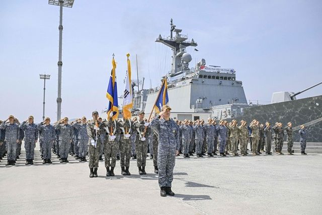 13일 경남 창원시 진해 군항에서 열린 청해부대 44진 강감찬함(DDH-II·4400톤급) 파병 복귀 입항 환영행사에서 청해부대원들이 복귀 신고를 하고 있다. 청해부대 44진 강감찬함은 지난해 11월 1일부터 194일 동안 아덴만 해역에서 국제해상교통로 보호를 위한 해양안보작전과 선박 안전항해지원, 다국적 해군과의 군사교류 활동을 펼치며 대한민국 해군의 위상을 드높였다. 2025.05.13 / 해군작전사령부 제공