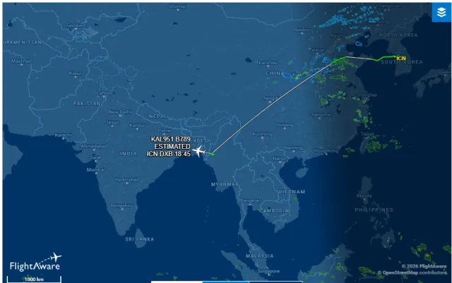 미얀마 상공에서 턴한듯? 턴하고 나서 계속 두바이쪽 간다고 나오는건 실제 항로가 아니라 예측항로인듯함