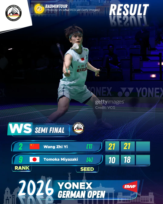 세계 랭킹 2위이자 이번 대회 1번 시드를 배정받은 톱랭커 왕즈이는 28일(한국시간) 대회 준결승전에서 일본의 세계 랭킹 9위 미야자키 도모카를 게임스코어 2-0(21-10 21-18)으로 꺾었다.