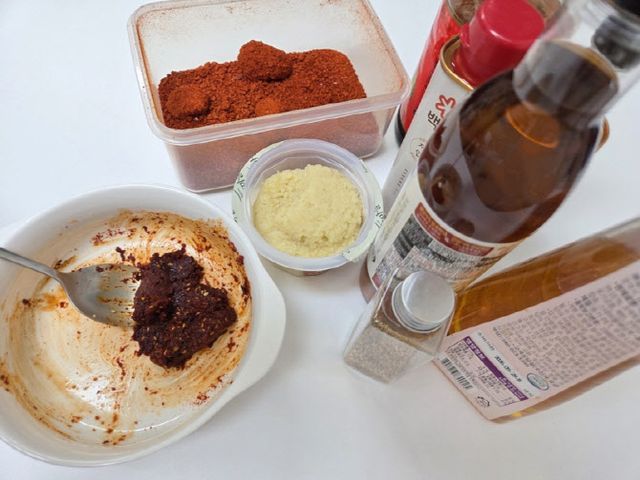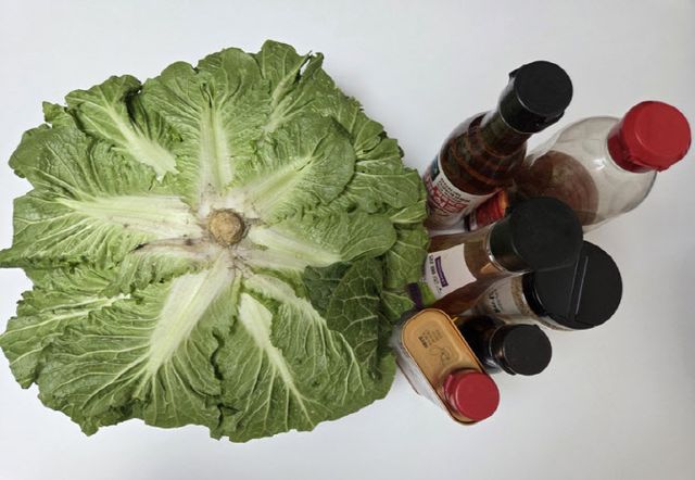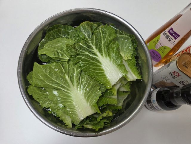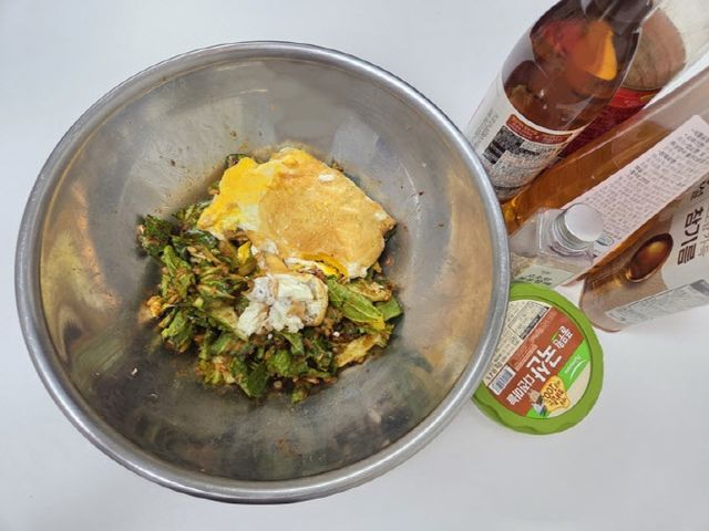 직접 구매한 봄동은 대형마트에서 한 봉지 3490원. 100g당 약 873원꼴이었다. 생각보다 양이 많았다. 속부분만 비빔밥에 쓰고, 질긴 겉잎은 따로 보관해 국이나 무침용으로 남겨둘 정도였다. 대부분 양념은 집에 있던 재료를 그대로 사용했다. 말 그대로 ‘냉장고 털이 음식’이다.