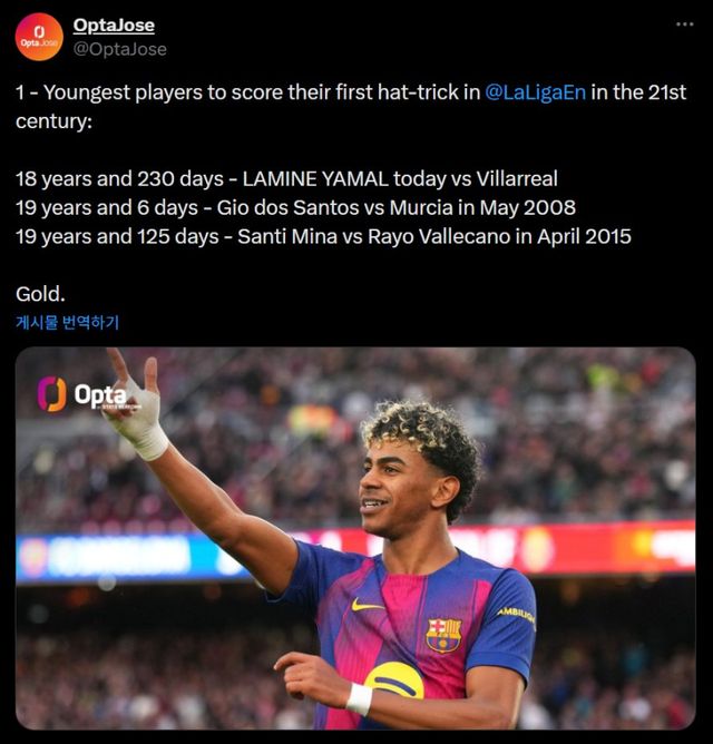 FC 바르셀로나 '신성' 라민 야말(19·스페인)이 프리메라리가(라리가)에서 '21세기 최연소' 해트트릭 주인공으로 이름을 올렸다.