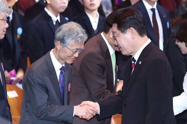 이재명 대통령이 1일 서울 강남구 코엑스에서 열린 제107주년 3·1절 기념식에서 조희대 대법원장과 악수를 나누고 있다. / 뉴스1