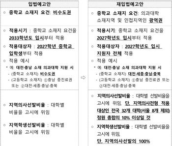 예를 들어 대전·충남 소재 의과대학에 지원할 경우, 기존 입법예고안에서는 비수도권 소재 중학교 출신이면 지원 가능했지만, 재입법예고안에서는 대전·세종·충남·충북 소재 중학교를 졸업해야 한다.