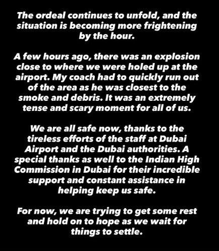 1일(한국시간) 인도 매체 '뉴스 18'은 신두와의 인터뷰를 공개했다. 신두는 "거주지인 인도 벵갈로르에서 버밍엄으로 가기 위해 두바이에 내려 환승하고 있었다"며 "그런데 우리 비행기가 두바이에 착륙하자마자 통제할 수 없는 일들이 벌어지기 시작했다. 곧 영공이 폐쇄됐으며 긴장된 몇 시간이 흘렀다"고 밝혔다.