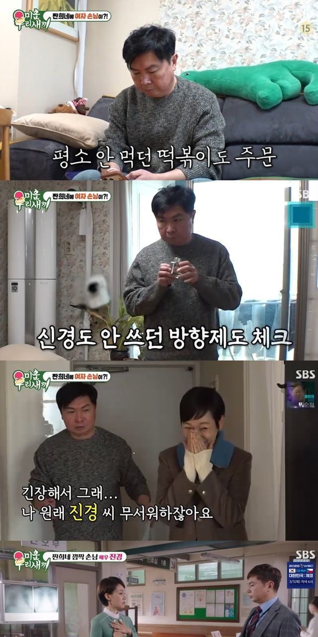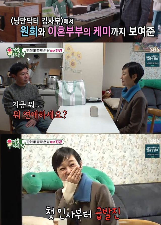 잠시 후 모습을 드러낸 이는 드라마 '낭만닥터 김사부'에서 임원희와 이혼부부 호흡을 맞췄던 진경이었다. 진경은 "얼굴 왜 이렇게 빨갛냐"며 웃음을 터뜨렸고, 임원희는 "긴장해서 그렇다. 나 원래 진경 씨 무서워하지 않냐"고 답했다.