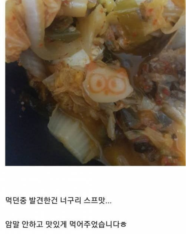 작성자는 "먹던 중 발견한 건 너구리 스프맛..."이라며 정체를 고백하면서도, "암말 안 하고 맛있게 먹어주었습니다"라고 덧붙여 아내의 정성을 생각하는 배려심 깊은 모습을 보였습니다.